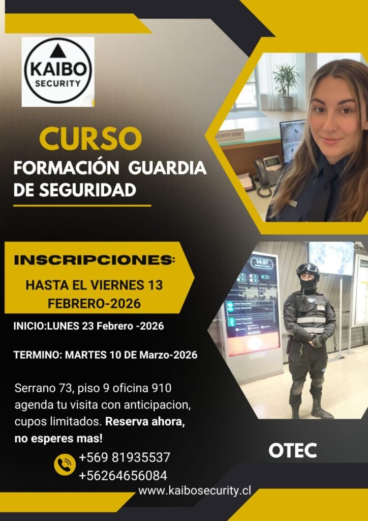 El Curso de Formación de Guardia de Seguridad en Santiago de Chile, impartido de manera presencial por Kaibo Security, entrega los conocimientos esenciales para desempeñarse profesionalmente en seguridad privada. La capacitación se realizará del 23 de febrero al 10 de marzo, cumpliendo con las normativas vigentes y enfocada en la preparación para el campo laboral.
