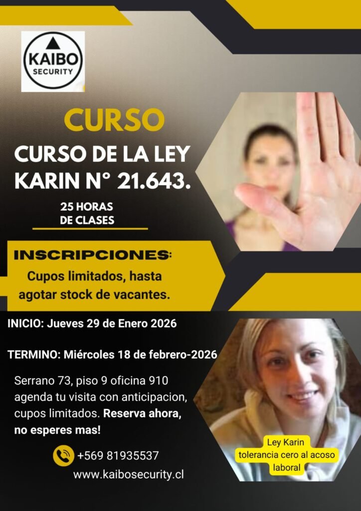 El Curso Ley Karin N° 21.643, impartido de manera presencial por Kaibo Security en Santiago de Chile, entrega formación sobre la prevención, abordaje y correcta gestión de situaciones de acoso y violencia en el entorno laboral. La capacitación se desarrollará del 29 de enero al miércoles 18 de febrero, con una duración total de 25 horas, orientada al cumplimiento normativo y a la promoción de ambientes laborales seguros y respetuosos.